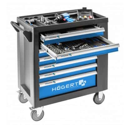 Продуманный мобильный шкаф-тележка с комплектом ручных инструментов (252 шт.), предназначенный для автосервисов, мастерских и гаражей. Оснащён семью выдвижными ящиками: шесть по 75 мм и один глубокий на 154 мм. Вверх — усиленная ABS‑панель. Прочные колёса на подшипниках (диаметр 5 × 1,24″), два из них — поворотные, с возможностью блокировки. Имеется центральный замок с ключом (в комплекте два ключа). Удобная организация инструментов в EVA-ложементах.