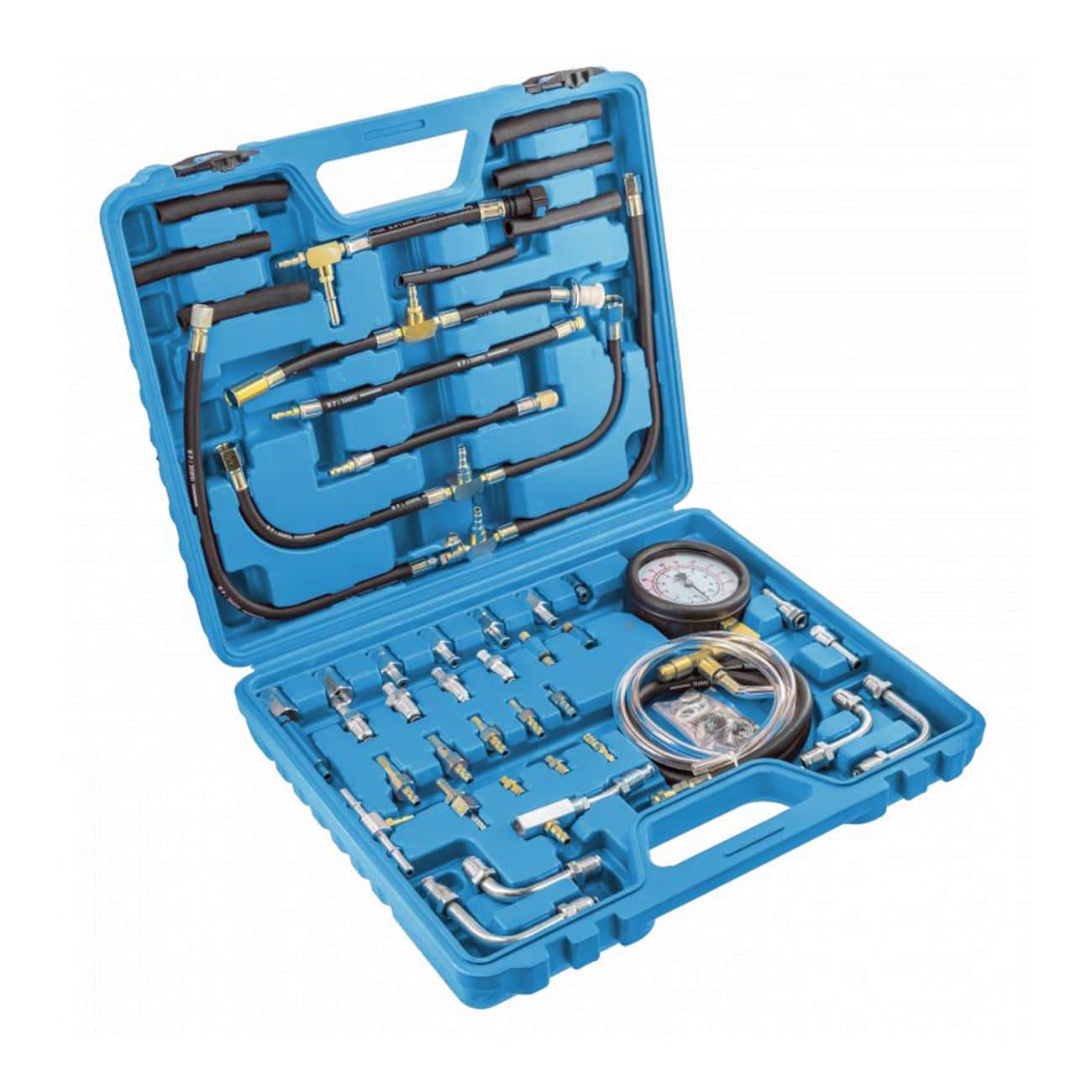 Тестер предназначен для диагностики систем впрыска топлива в бензиновых двигателях. Комплект включает манометр с гибким шлангом и набор насадок, что облегчает подключение в труднодоступных местах. Манометр оснащён чёткой двойной шкалой (бар и PSI) и защищён резиновым демпфером, повышающим его ударопрочность. Устройство компактно упаковано в пластиковый кейс для удобства хранения и транспортировки.