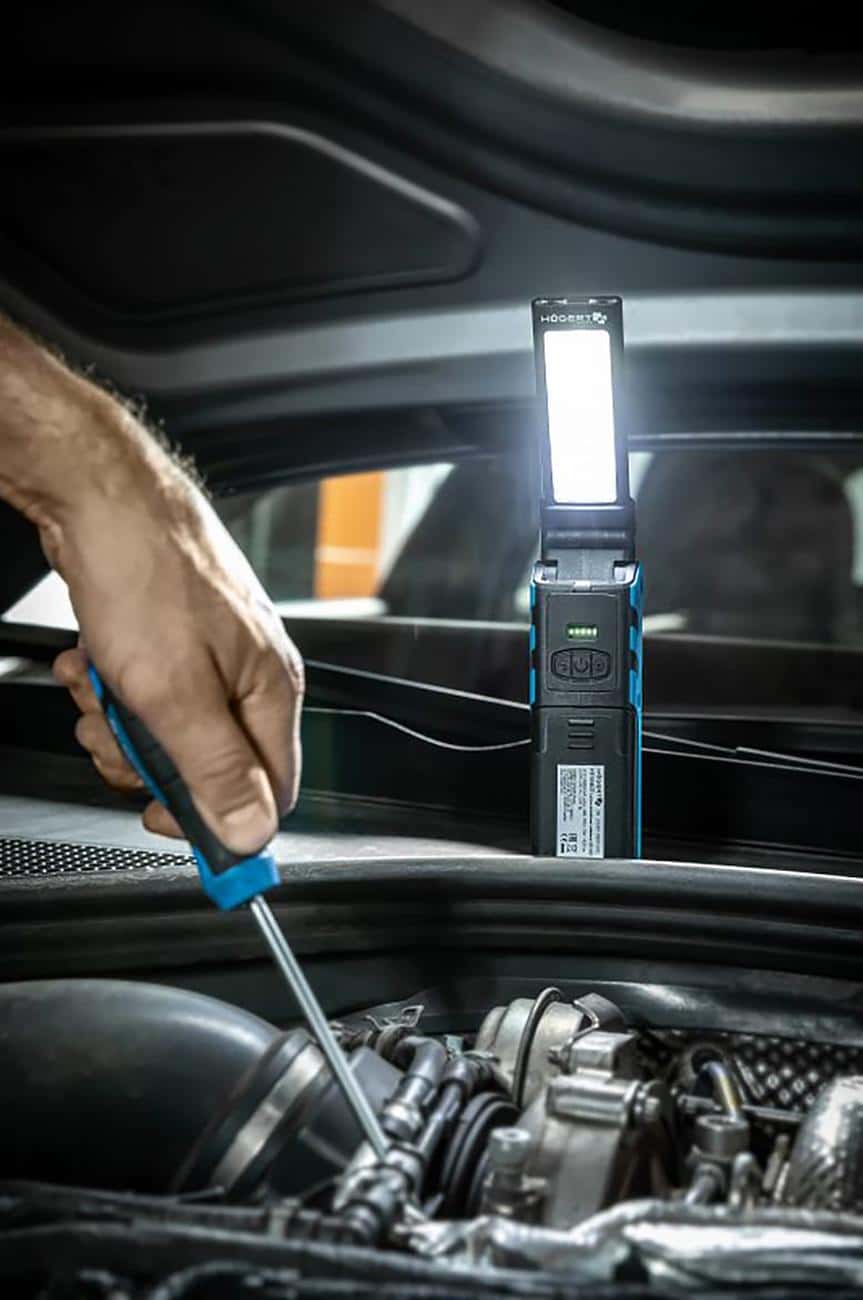 • Пыле- и влагозащита IP54 — подходит для работы в сложных условиях, в том числе при ремонте и обслуживании автомобилей.