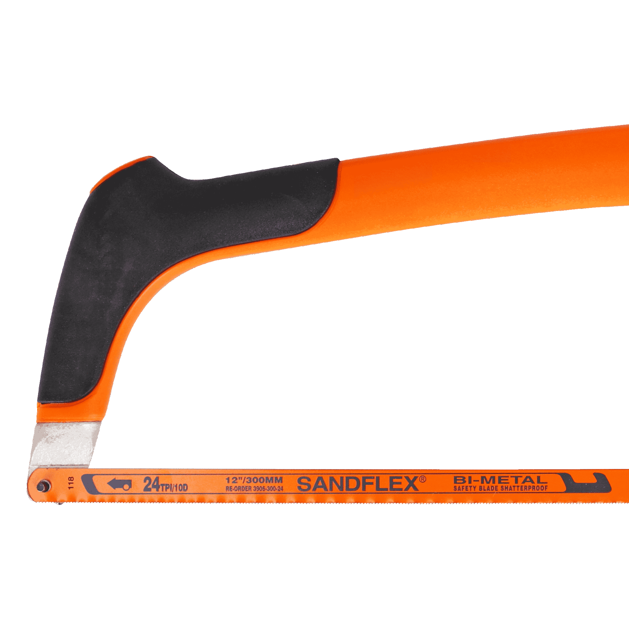 Комплектуется полотном Sandflex® длиной 300 мм и с шагом зубьев 24 TPI — оптимально сбалансированное сочетание скорости и гладкости реза. Рама допускает установку полотна под углом до 55° для резки в труднодоступных местах.