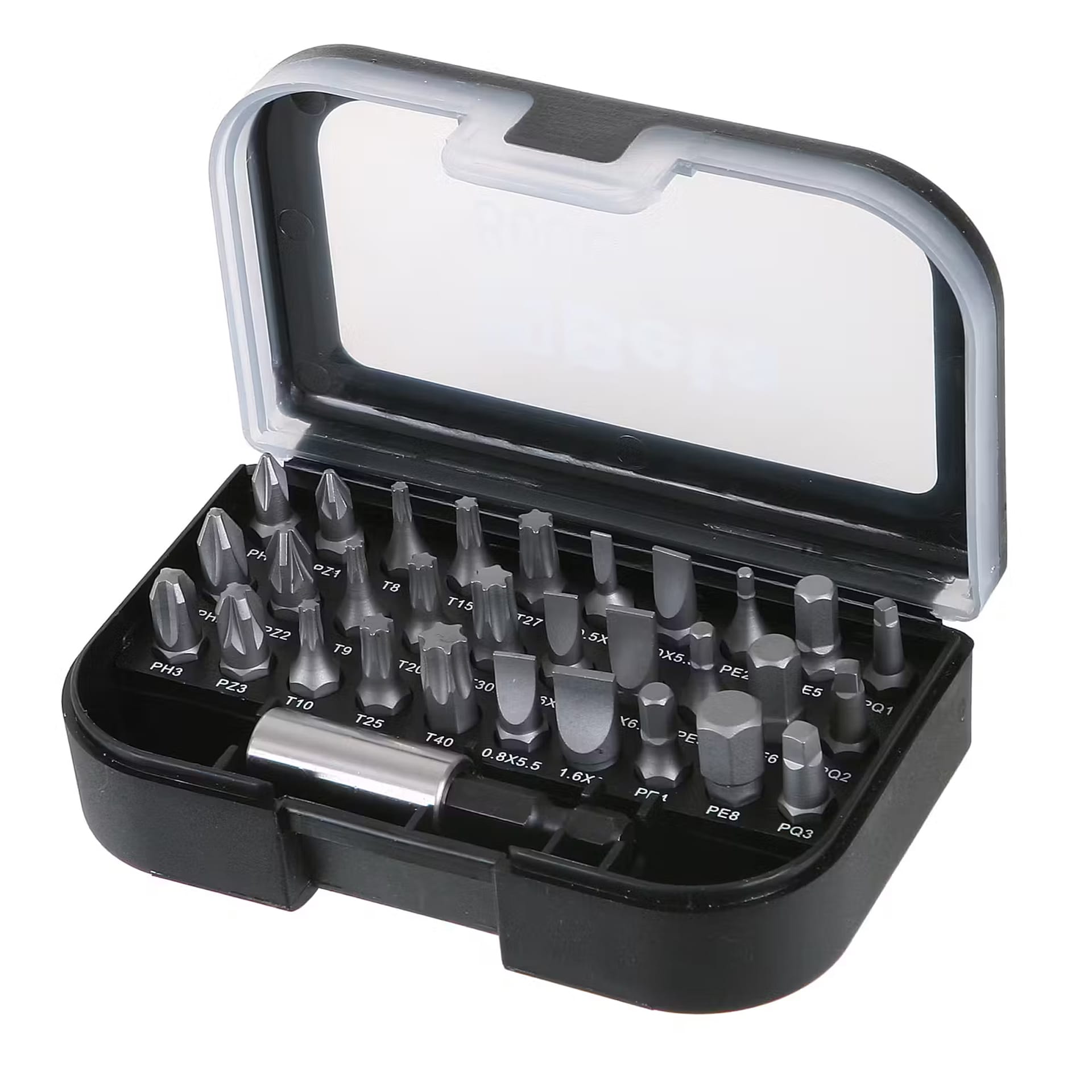 Профессиональный набор битов от итальянского бренда Beta Tools - универсальный комплект из 30 битов для широкого спектра задач: шлицевые, крестовые, шестигранные, Torx, Pozidriv и квадратные. Включает магнитный держатель и чёрный кейс с прозрачной крышкой.