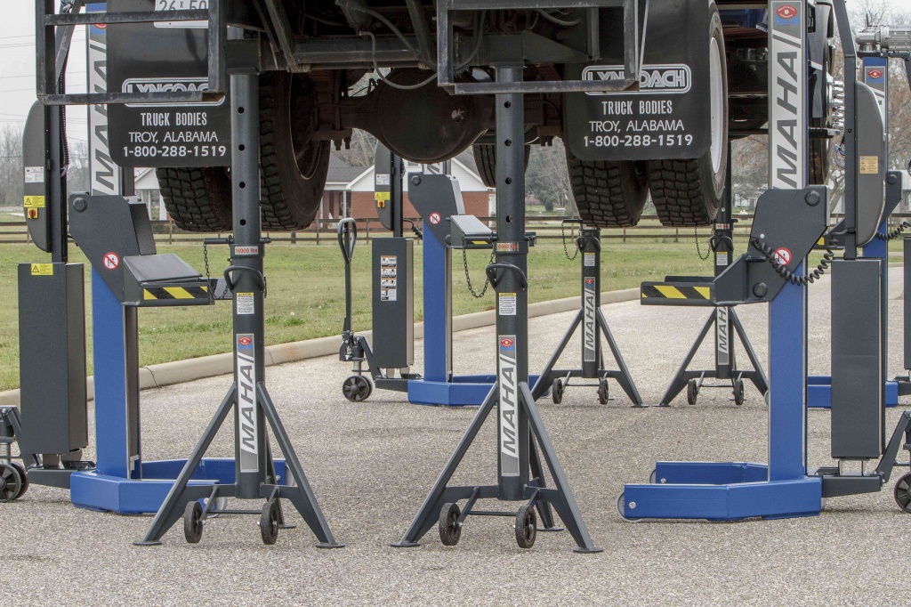 Подкатной подъемник MAHA RGE — мобильная колонная система для обслуживания грузовых автомобилей и автобусов. Каждая колонна оснащена винтовым приводом и мобильностью, что позволяет гибко позиционировать их под колёсами транспортного средства. Подъёмник обеспечивает надёжный подхват и синхронизированный подъём колонн, что повышает безопасность и удобство работ.