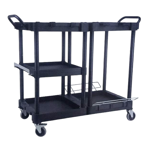 Тележка сервисная. Металлический каркас, полки из ударопрочного пластика, с креплениями для мусорного мешка. Для предприятий общественного питания, гостиниц (рум-сервис). Вес 25кг.