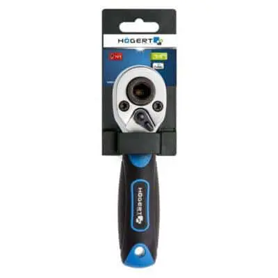 Компактная и мощная ручная трещоточная рукоять с 1/4 приводом (6.3 мм), пригодная для бит и торцевых головок. Корпус выполнен из прочной Cr V‑стали, а механизм из CrMo‑сплава (хром-молибденовая сталь), содержит 72 зубца, обеспечивающие минимальный угол поворота (~5°) даже в ограниченном пространстве. Профиль рукояти — эргономичный, bi-material, с анти скользящим покрытием. В конце предусмотрен пластиковый подвес. Подходит для бит и головок без необходимости смены ключа.