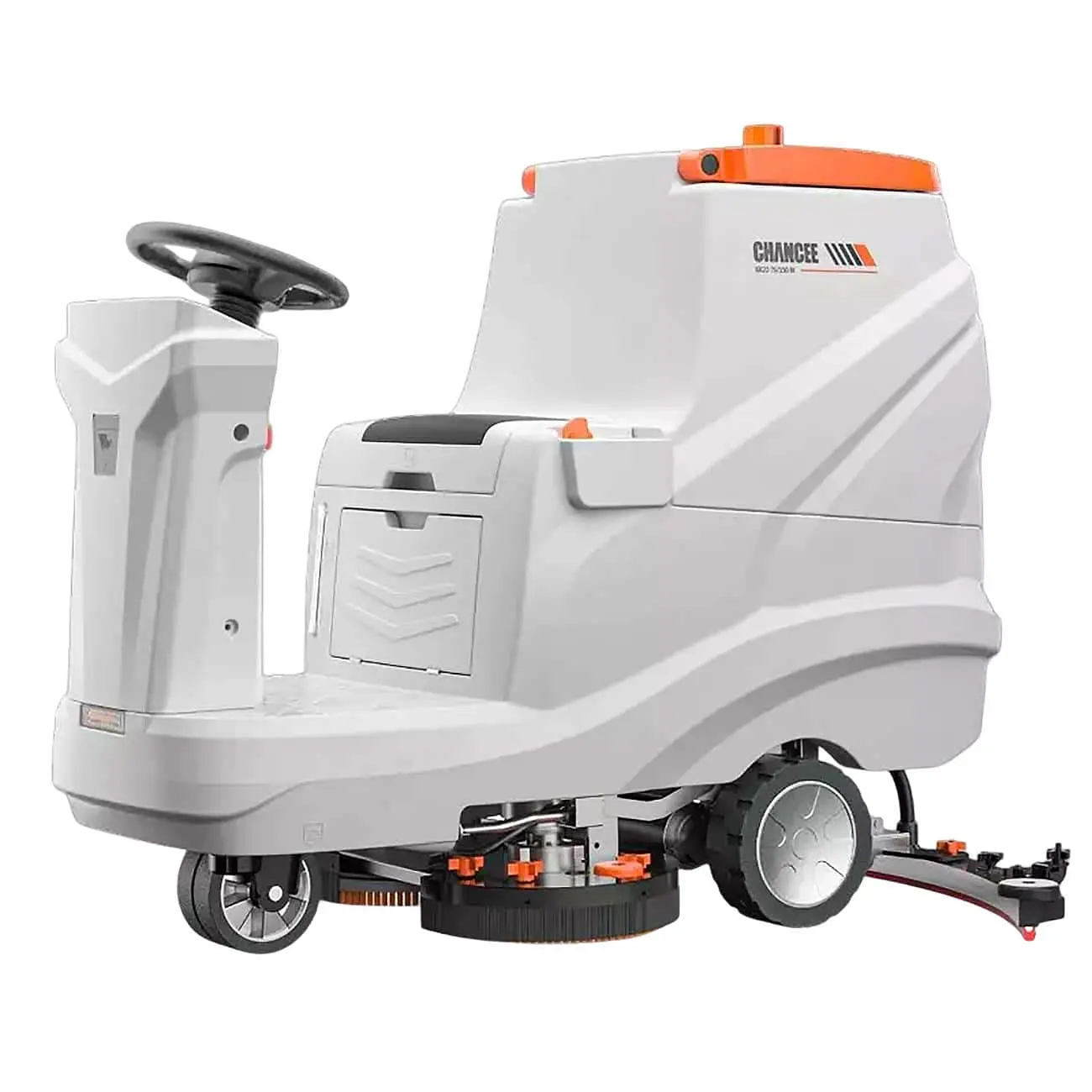 Chancee K80+ — высокоэффективная аккумуляторная поломоечная машина с сиденьем для оператора (ride-on), предназначенная для уборки больших площадей. Обеспечивает комфорт работы, простое управление и мощную очистку благодаря двойной щёточной системе и большому объёму баков.