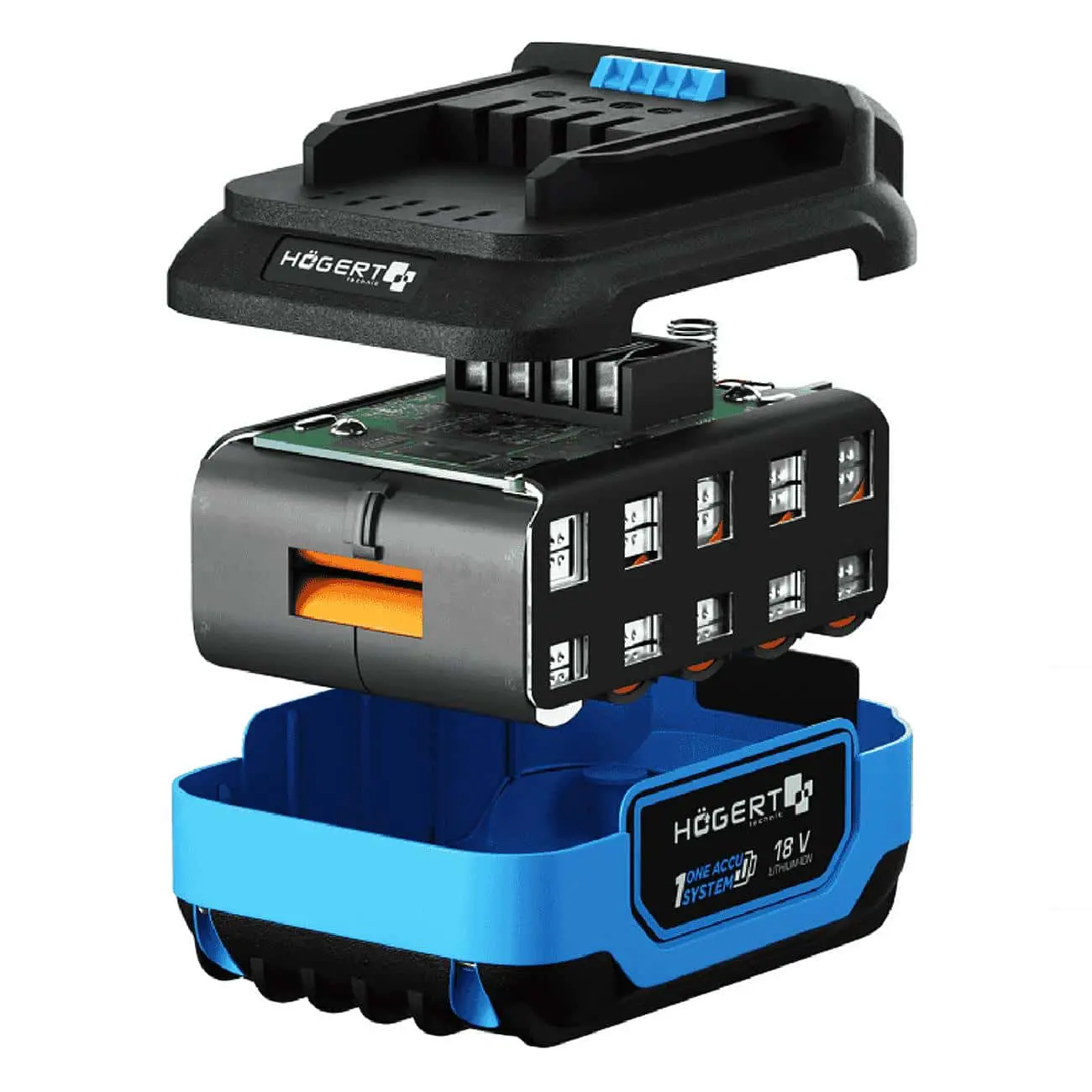 • Система OneAccuSystem 18 V — аккумулятор совместим со всеми 18‑вольтными электроприборами Högert, что экономит инвестиции и облегчает управление инструментами.