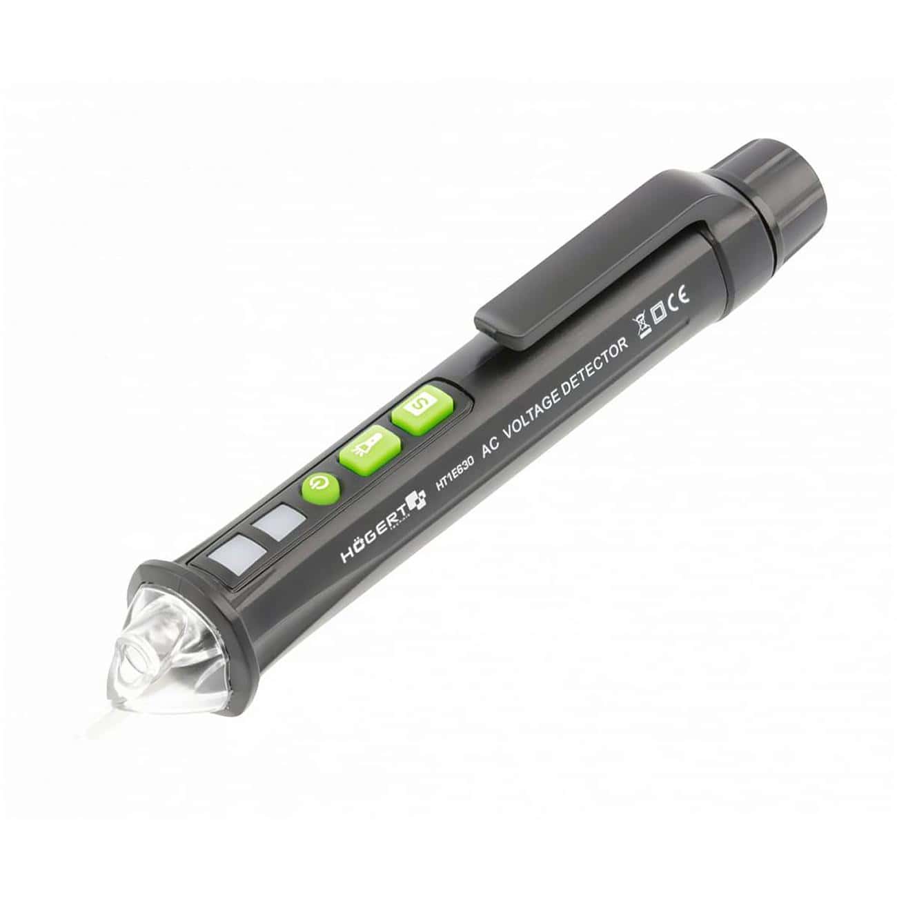 Профессиональный бесконтактный индикатор напряжения, позволяющий безопасно определить наличие фазы без прямого контакта с проводами. Излучает свет и звуковой сигнал при обнаружении токоведущего проводника. Также способен проверять целостность кабеля за счёт встроенного теста на непрерывность контура. Оснащён встроенным фонариком и работает от двух батареек AAA с функцией автоматического выключения для экономии энергии