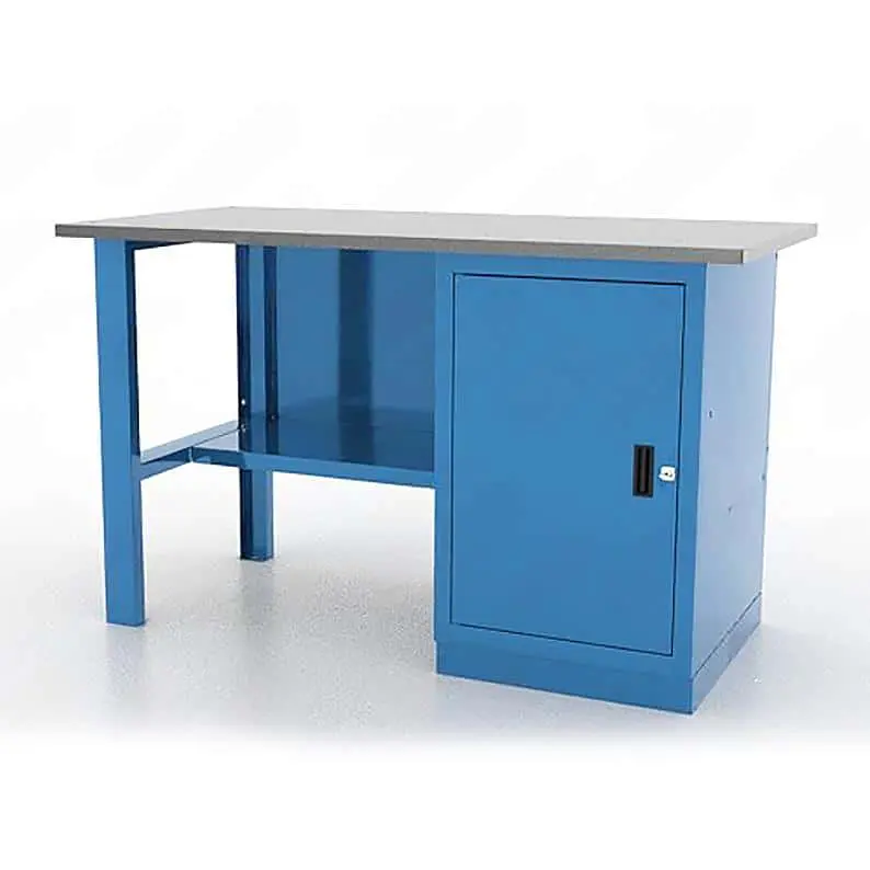 Металлический однотумбовый верстак FERRUM Classic 01.100L- 5015 — профессиональный инструмент для автосервисов, мастерских и гаражей. Оборудован MDF‑столешницей толщиной 27 мм с оцинкованным кожухом 1,2 мм, двуслойным порошковым покрытием и надёжной тумбой с полками и замком. Тумба с дверцей и двумя полками, замок и два ключа; дверца переставляется под открывание любой стороной