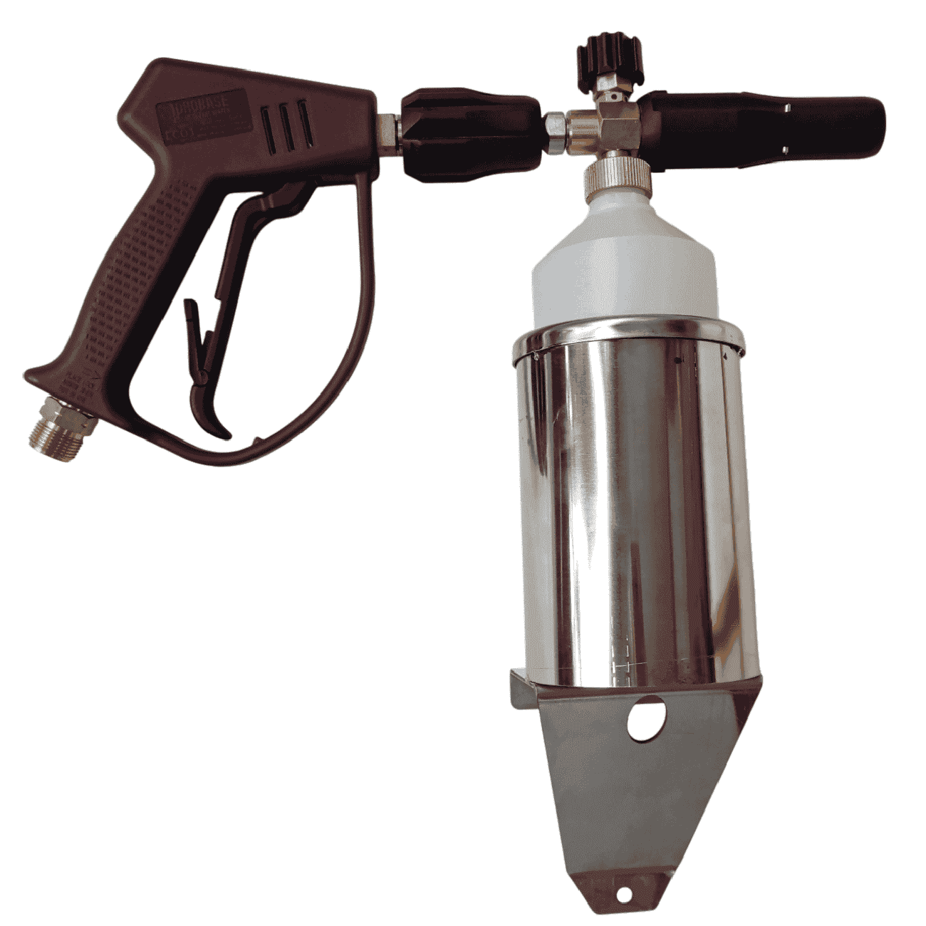 Надёжный и компактный держатель для хранения пенокомплекта, разработанный для удобного размещения оборудования на посту мойки. Устанавливается вертикально на стену и обеспечивает безопасное хранение пеногенератора в перерывах между работой.