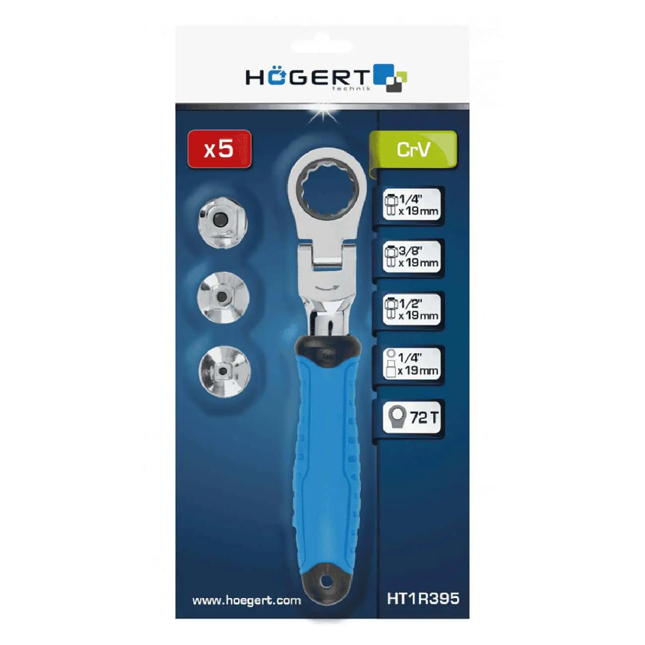 Инновационный ключ-насадка представляет собой высококлассный инструмент из хром-ванадиевой стали (CrV), сочетающий в себе трещоточный (ratchet) и шарнирный функционал. Основное кольцо рассчитано на размер 19 мм, механизм оснащён 72 зубьями, что позволяет работать при минимальном угле поворота. В комплект входят 5 сменных адаптеров (с приводами 1/4, 3/8, 1/2 и битовый адаптер), которые делают инструмент совместимым с различными насадками и битами. Шарнирная головка обеспечивает регулировку угла работы для доступа в труднодоступные места