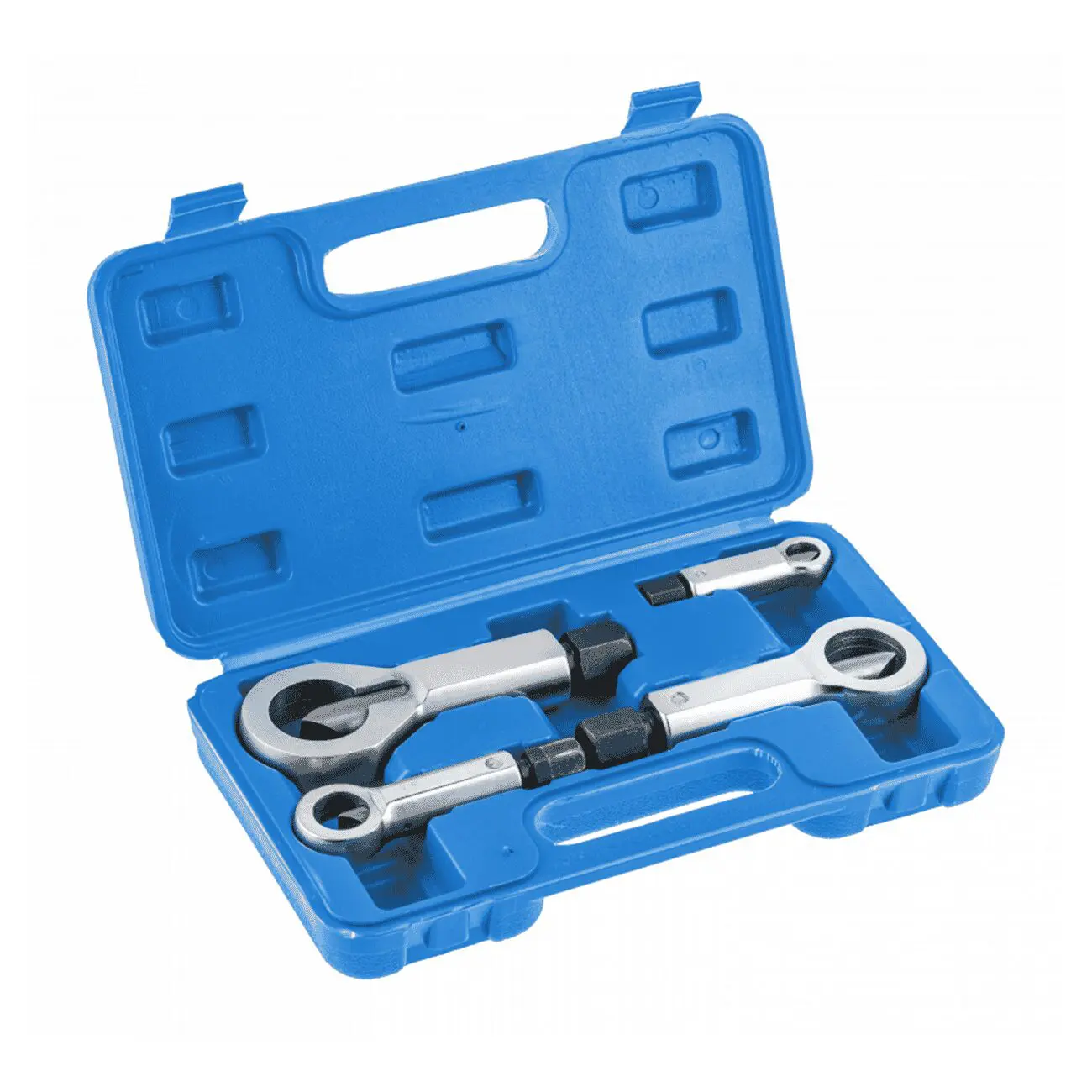 Набор включает четыре механических гайколома различных размеров, предназначенных для безопасного удаления сильно закрученных, проржавевших или повреждённых болтов и гаек. Уникальная конструкция исключает разрушение резьбы и подходит для работы даже с болтами, чей шестиугольник исчерпан. Применение — автомобили, промышленные и слесарные мастерские.