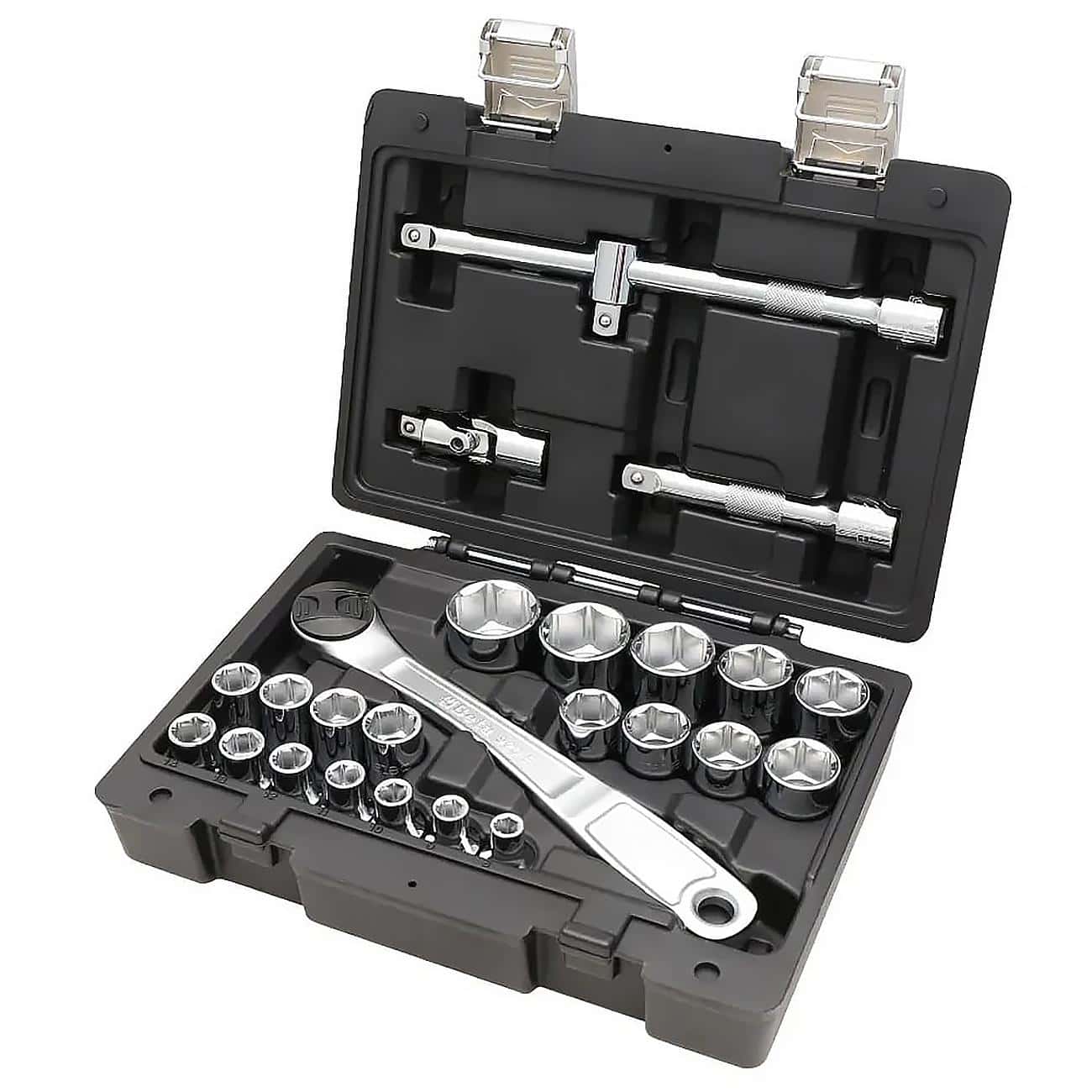 Профессиональный комплект Beta Easy, включающий 20 торцевых головок (8–32 мм) и пять аксессуаров: трещотка, карданный шарнир, два удлинителя и переходник. Всё компактно упаковано в пластиковый кейс — готов к работе с любой техникой.