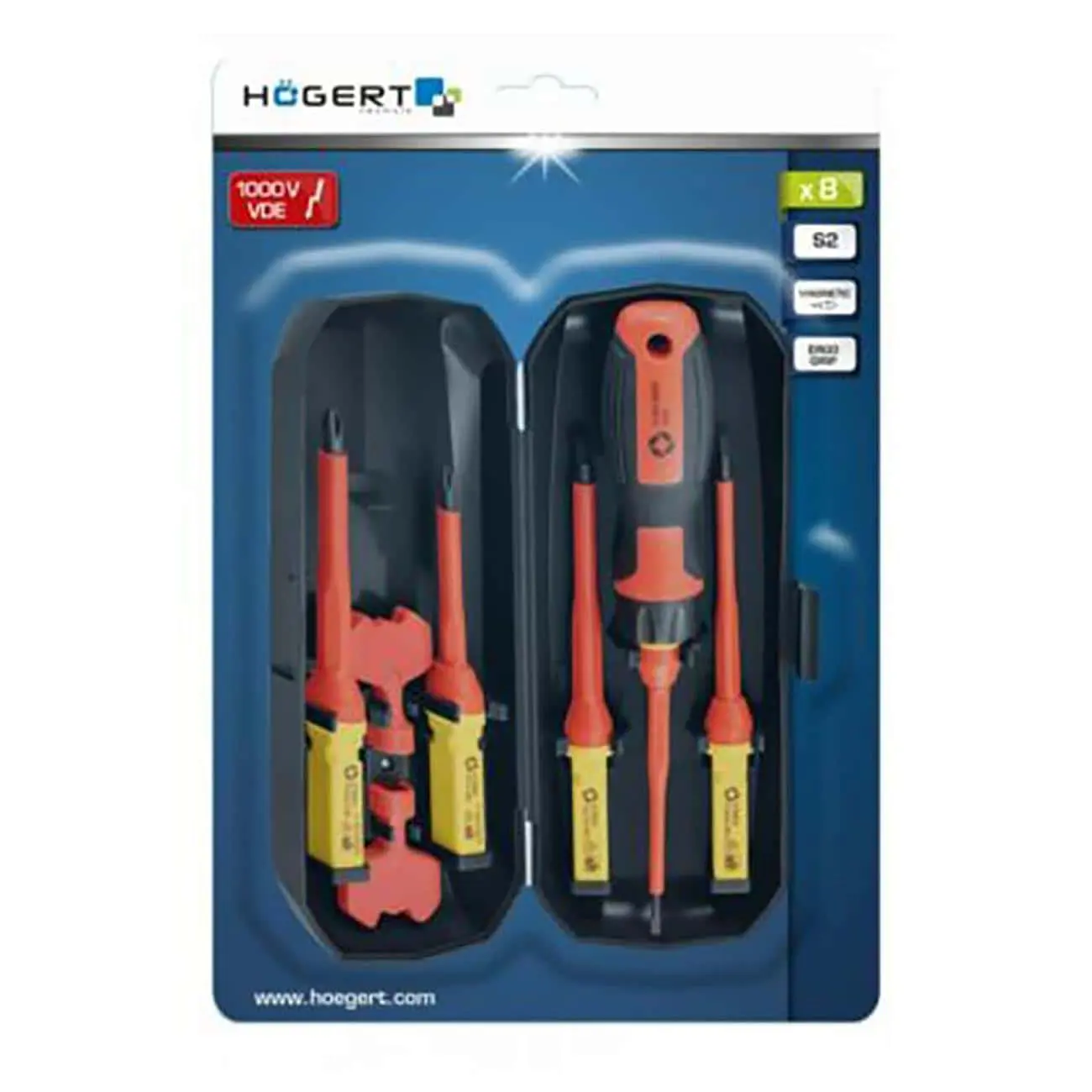 Комплект из 8 изолированных отвёрток, предназначенных для безопасной работы с электрическими цепями под напряжением до 1000 В переменного тока. Оснащён удобной эргономичной рукоятью с изоляцией. Конструкция включает магнитные биты из S2‑сплава, удобные как для домашнего использования, так и для профессионального применения.