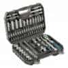 Профессиональный инструментальный комплект содержит 85 предметов — торцевые головки, биты, удлинители, держатели, трещотки, комбинированные ключи и аксессуары под приводы 1/4″ и 1/2″. Все компоненты изготовлены из прочной хром-ванадиевой стали (CrV), а механизм трещотки выполнен из CrMo с 72‑зубым механизмом для работы даже при минимальных углах поворота. Инструменты упакованы в прочный пластиковый кейс двухцветного дизайна с металлическими замками и петлями.