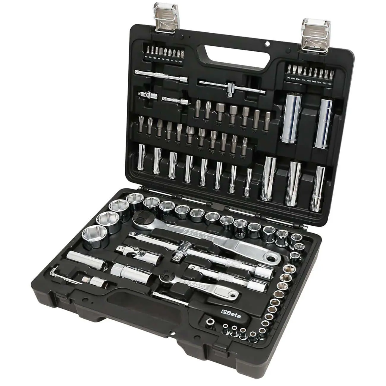 Универсальный комплект Beta Easy 903E/C98 включает 98 инструментов: головки (4–32 мм), разнообразные биты, вспомогательные аксессуары и две трещотки. Всё упаковано в прочный пластиковый кейс для удобства хранения и переноски.