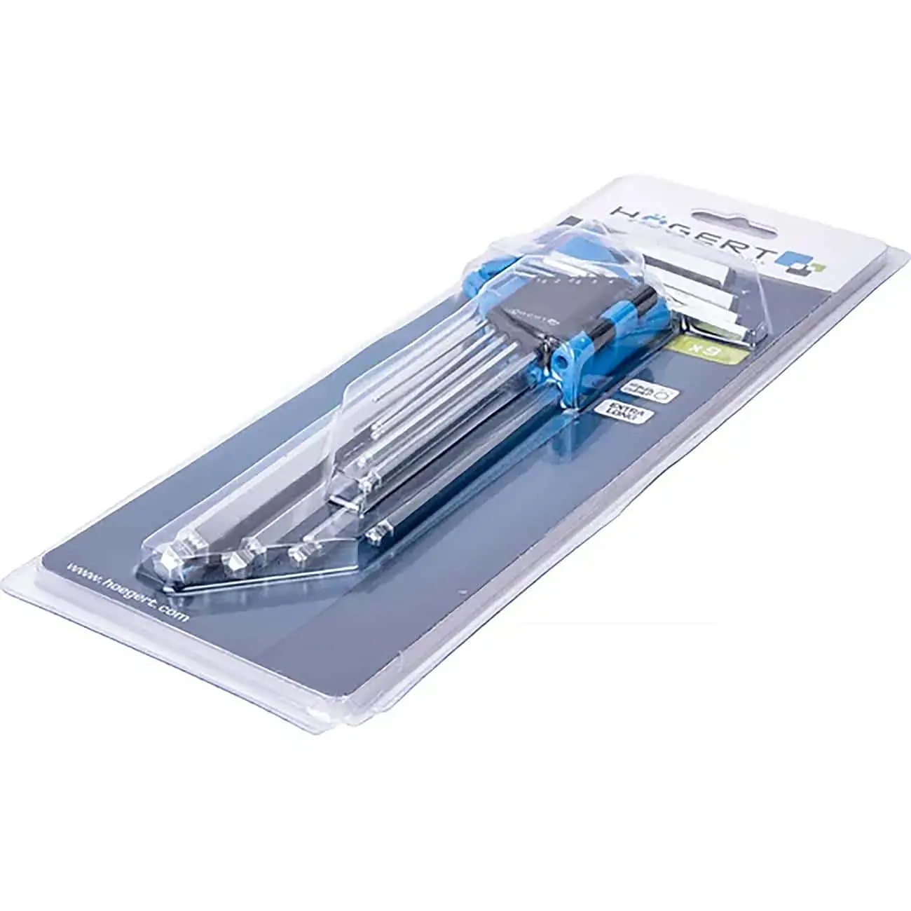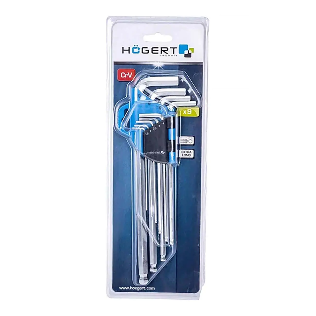 Hogert – это набор из 9 длинных шестигранных ключей с шариковым наконечником, изготовленных из хром-ванадиевой стали (CrV). Размеры ключей варьируются от 1,5 до 10 мм, что делает комплект универсальным решением для большинства задач. Шаровый конец позволяет работать под углом до 30°, облегчая доступ к крепежу в труднодоступных местах. Хранится набор в прочной компактной пластиковой упаковке с маркировкой размеров для быстрого выбора.