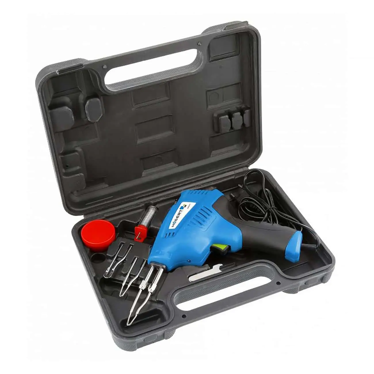 • Комплектация в пластиковом кейсе: два сменных жала, флюс, припой и ключ для замены.
