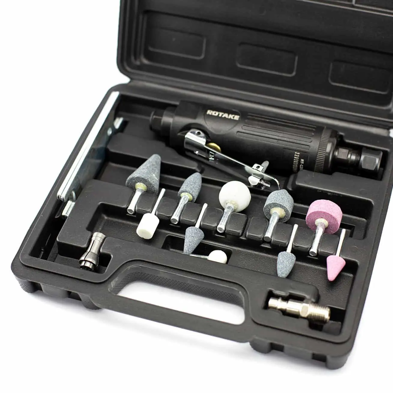 ROTAKE RT-1206K — компактная и мощная пневматическая шлифмашина, предназначенная для высокоскоростной обработки в ограниченных пространствах. С максимальной частотой вращения 22 000 об/мин и мощностью 0,3 л.с. (220 Вт), она идеально подходит для шлифовки, полировки, снятия заусенцев и подготовки поверхностей в автомобильной и слесарной отраслях.