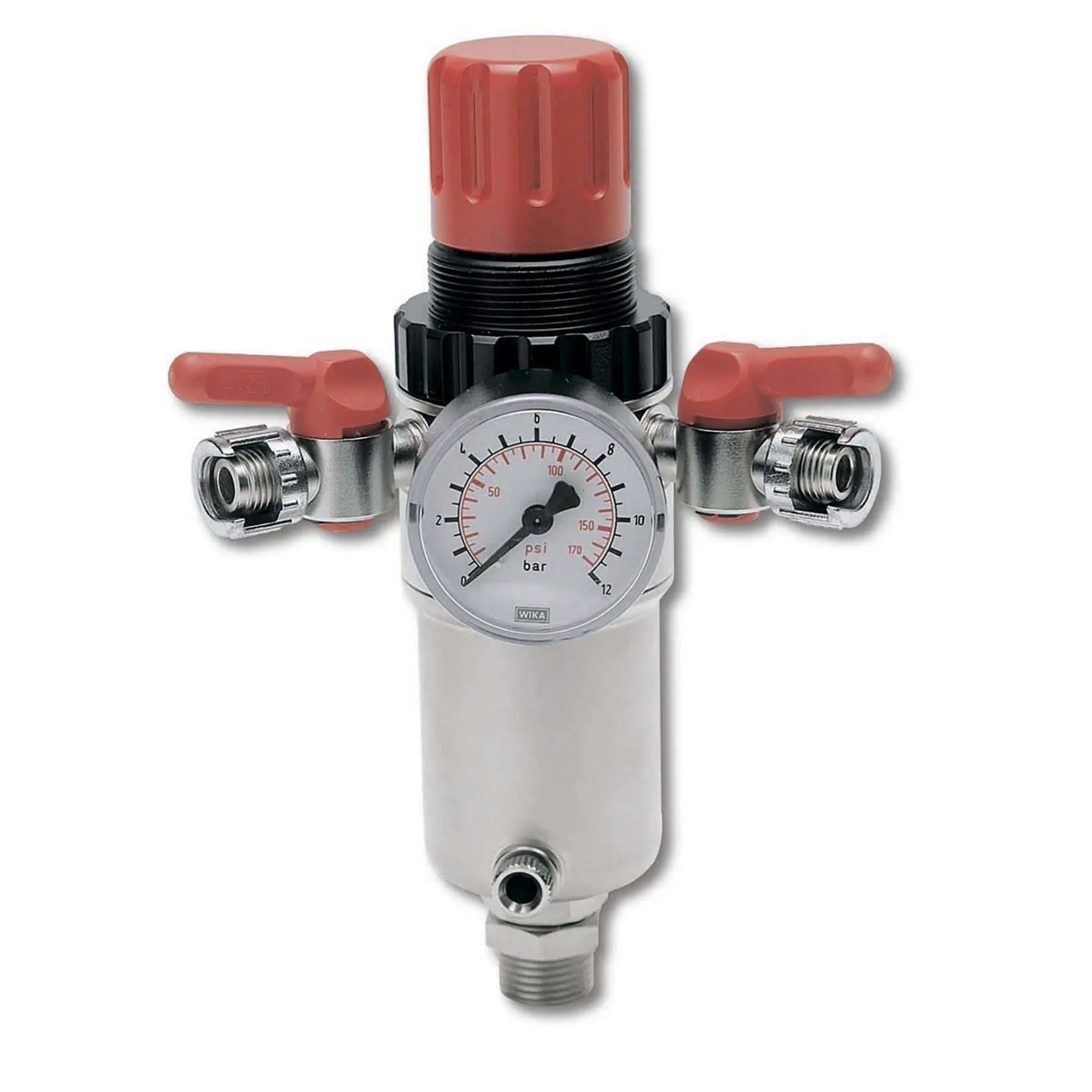 Регулятор может оснащаться манометром, регуляторной ручкой и защитными механизмами (например, сброс давления при превышении).