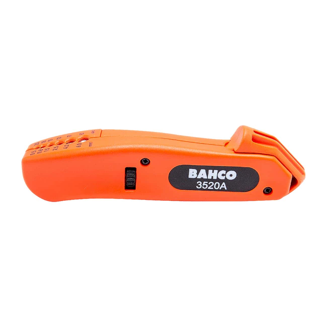 Bahco 3520‑A — надёжный инструмент для зачистки круглых кабелей, сочетающий точность и простоту в одном изделии. Состоит из поворотного лезвия с механическим фиксатором: нажатием кнопки лезвие поворачивается на 90° для продольного среза, затем автоматически возвращается, обеспечивая быстрый и равномерный надрез изоляции.