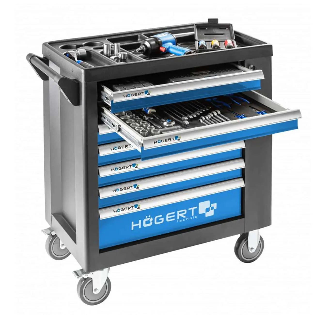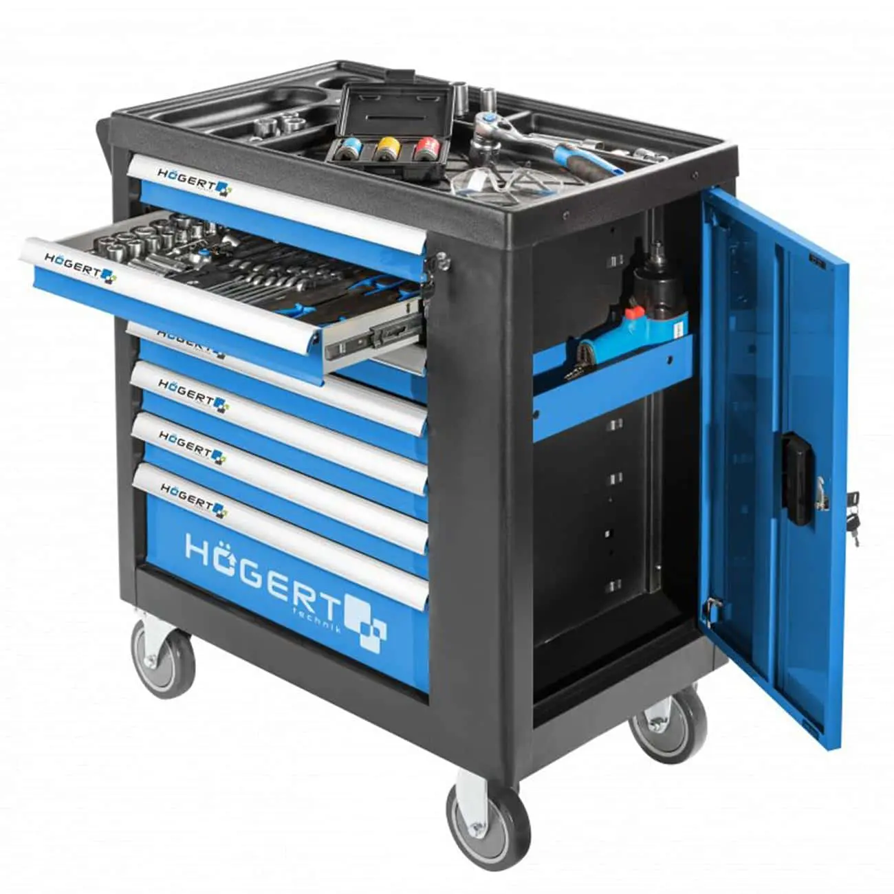 Прочная мобильная тележка-мастерская из стали, имеющая 7 выдвижных ящиков (шесть по 50 мм, один глубокий 130 мм), боковую дверцу со встроенным шкафчиком и прочный верхний ящик. Оснащена четырьмя колесами TPR диаметром 5 × 1,25” с подшипниками — два из них поворотные с тормозами. Эргономика сочетается с надёжностью и безопасностью (блокировка ящиков, замок, EVA наполнители).
