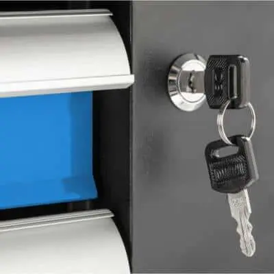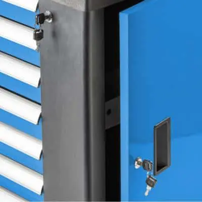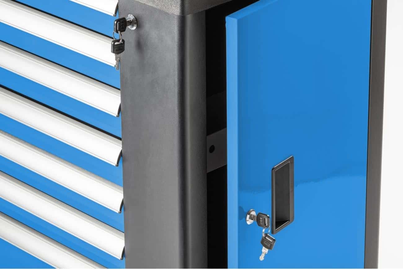 • Замки и блокировки: каждый ящик имеет индивидуальное закрытие против самопроизвольного открытия; центральный замок с двумя ключами защищает содержимое при перемещении.