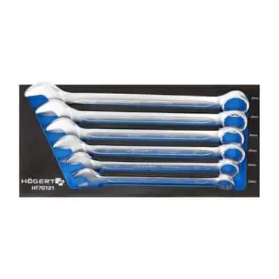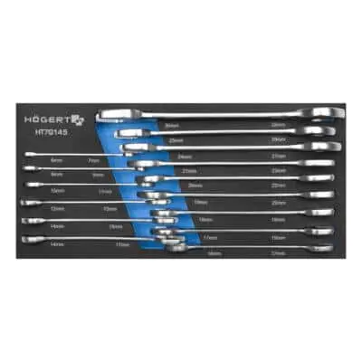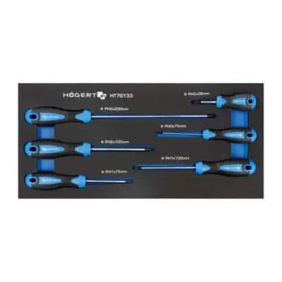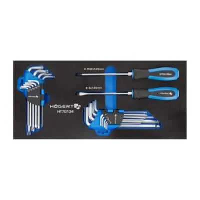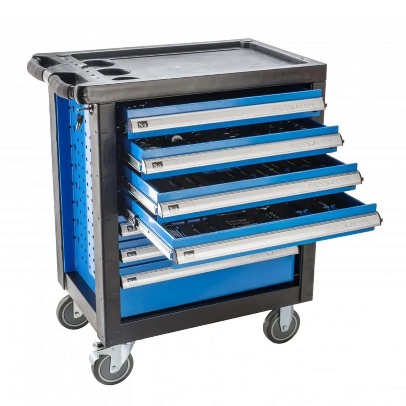 Продуманный мобильный шкаф-тележка с комплектом ручных инструментов (252 шт.), предназначенный для автосервисов, мастерских и гаражей. Оснащён семью выдвижными ящиками: шесть по 75 мм и один глубокий на 154 мм. Вверх — усиленная ABS‑панель. Прочные колёса на подшипниках (диаметр 5 × 1,24″), два из них — поворотные, с возможностью блокировки. Имеется центральный замок с ключом (в комплекте два ключа). Удобная организация инструментов в EVA-ложементах.