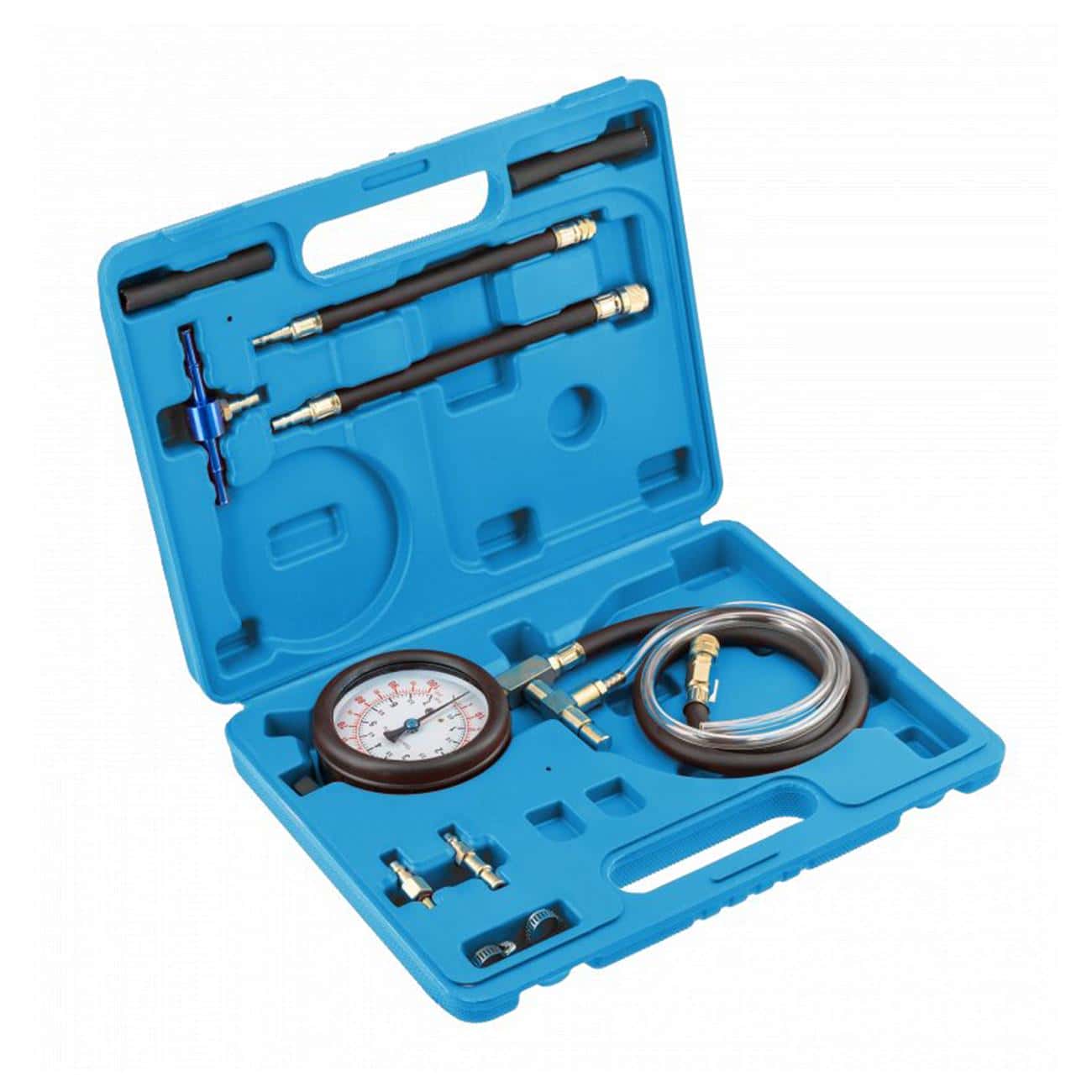 Это профессиональный механический набор для измерения давления топлива в системе впрыска бензиновых и дизельных двигателей. Он оснащён аналоговым манометром с двойной шкалой (бар и PSI), что упрощает считывание результатов. Манометр защищён резиновой амортизирующей оболочкой и выполнен из лёгких, но прочных материалов. Комплект оснащён быстроразъёмными соединениями, гибкими шлангами и адаптерами для удобства подключения в разных режимах диагностики